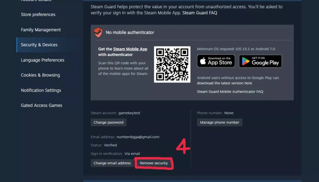 - در نهایت، با کلیک روی گزینه Remove Authenticator میتوانید استیم گارد را غیر فعال کنید: