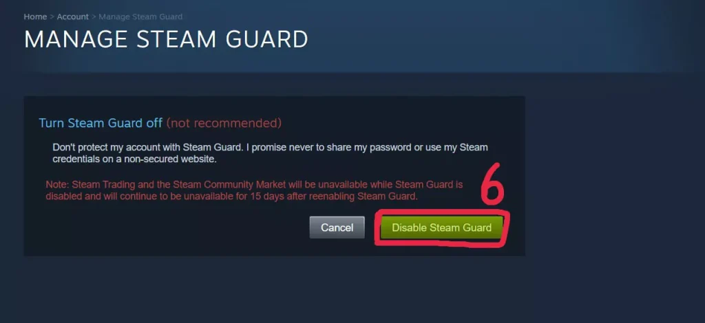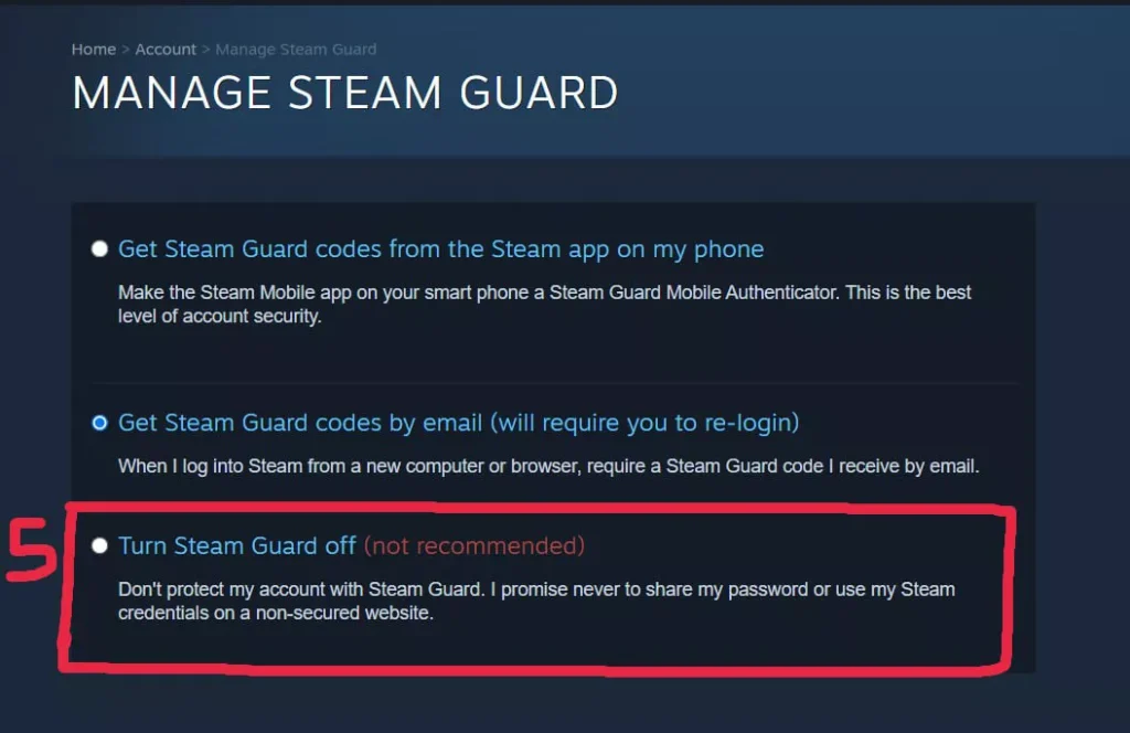 مرحله 5: انتخاب گزینه خاموش کردن Steam Guard