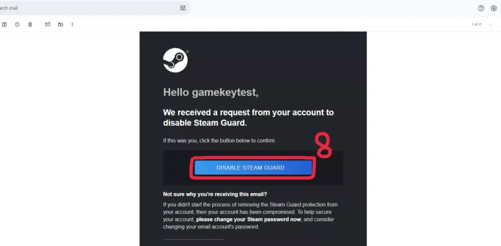 وارد ایمیلی که با آن در استیم ثبتنام کردهاید شوید. یک ایمیل تأییدیه از طرف Steam دریافت خواهید کرد. آن را باز کرده و روی دکمه DISABLE STEAM GUARD کلیک کنید تا فرآیند کامل شود.
