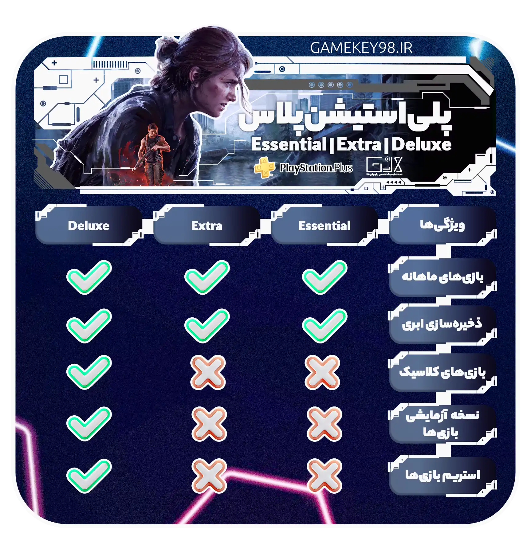 | 🎃 | لیست بازی های پشتیبانی شده : ببینید اشتراک پلاس پلی استیشن در 3 مدل برای شما عزیزان قابل خرید میباشد که خب طبیعتا هر نوع اشتراک یک مدل کارکرد و قابلیت هایی دارد که میتواند بر روی قیمت آن نیز اثر گذار باشد که تفاوت 3 مدل اشتراک در تصویر اپلود شده در بخش زیر قابل مشاهده میباشد و شما میتوانید با خرید هر یک از اشتراک های Essentials و Extra و Deluxe با توجه به نوع نیاز خود و مدل استفاده ای که دارید از قابلیت های فوق العاده آن استفاده کنید | Click Here – مقاله رسمی تفاوت اشتراک ها | شما میتوانید به لینک کناری برای اطلاعات تکمیلی مراجعه کنید | |